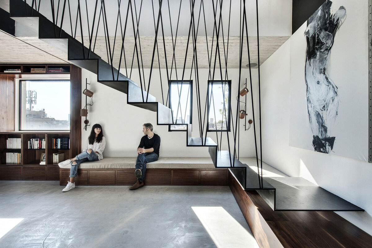 Проектное бюро Toledano + Architects оформило интерьер дуплекс-пентхауса в Тель-Авиве, Израиль. Перед архитекторами стояла задача по созданию тихой родительской зоны, интересной детской спальни и общей гостиной зоны, располагающей к совместному времяпрепровождению, шумным и весёлым играм. И все это — в рамках двухуровневого пространства площадью 160 квадратных метров, окружённого террасой. В результате детская комната напоминает игровую площадку, в ней есть не только спальное место, но и стол, доска для рисования, книжные полки, гардеробная, танцевальный станок и даже подобие домика на дереве. Родительский сьют обособлен от остальных помещений резиденции и оформлен в совершенно ином стиле — спальня и ванная выполнены в бетоне. В пентхаусе много многофункциональных элементов — раздвижные двери, скрытый в книжном шкафу бар, выдвижной металлический стол и прочие детали, благодаря которым жильцы могут адаптировать резиденцию. Для создания современной атмосферы архитекторы использовали дер