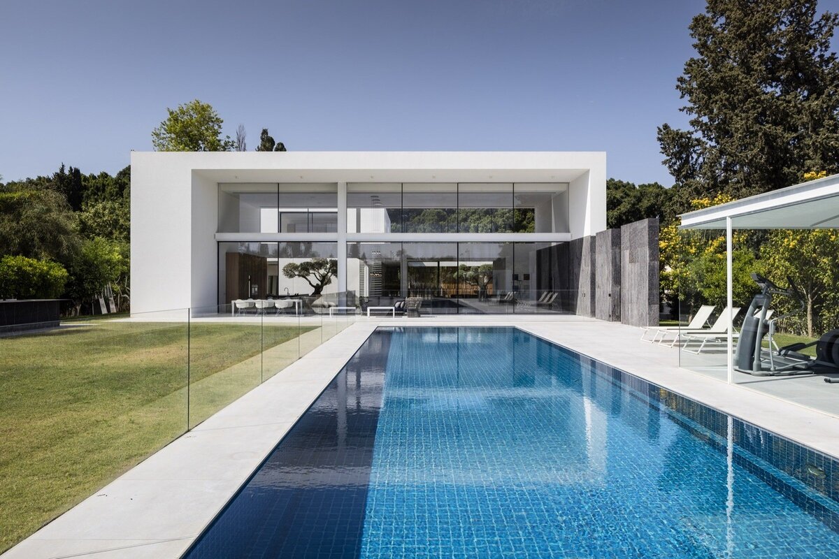 Возведённая Pitsou Kedem Architects частная резиденция площадью 700 квадратных метров полностью соответствует поговорке «Мой дом — моя крепость». В концепции архитекторы отталкивались от образа древнеегипетского храма, где посвящённые преодолевали серию дворов и пространств, постепенно приближаясь к сокровенной цели. Непроницаемая монолитная стена из тёмного камня — это то, что человек может видеть снаружи здания. Герметичность стены смягчена аллеей молодых деревьев, направляющей посетителя в первый внутренний двор, обрамлённый ажурной деревянной оградой. Само движение к дому, особенно с момента вступления на огороженную территорию — это процесс постепенного отделения от внешнего мира и погружения в проживание настоящего момента. Всё внимание теперь может быть сосредоточено на созерцании структуры здания. Стоя перед большой прозрачной стеной, можно видеть всё, что происходит внутри, ведь сюда допускаются только избранные. Хотя фасад, обращённый на улицу, выглядит как непрозрачная масс