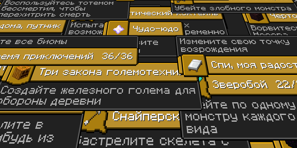 Minecraft 1.12 представил игрокам новые достижения. Старые «ачивки» навсегда удалены из игры, лишь некоторые из них были реализованы повторно. Поэтому я бы хотел немного остановиться на особенностях новой системы достижений. Кроме того, поскольку названия достижений (как в оригинале, так и в переводе) содержат различные отсылки или шутки, то хотелось бы рассказать и об этом. Особенности новой системы достижений Главная особенность advancements (так называется новая система достижений на английском) — это возможность добавления новых достижений, используя конфигурационные файлы. То есть все достижения, существующие в игре, не «запрограммированы», а описаны в json-файлах. И при желании, вы сможете самостоятельно добавить в игру новые достижения. Система достижений, судя по всему, перерабатывалась для того, чтобы упростить разработчикам возможность добавления новых достижений в игру. При этом, система обладает очень большими возможностями, и нам ещё предстоит осознать грандиозность