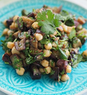 Сочетание баклажанов и нута, рождает ароматный, сытный и очень вкусный салат. Особенный вкус этому салату придает заправка с пряными травами и специями.