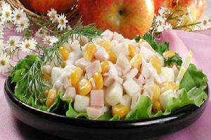 Соль - по вкусу Приготовление: Разрежьте пополам, очистите перец от семян, вымойте и обсушите. Выложите в жаропрочную форму и отправьте в разогретую до 200 градусов духовку. Запекайте минут 15-17 до румяности, в процессе переворачивая. Тушки кальмаров вымойте, очистите от пленок и отварите в подсоленной воде 3-4 минуты после закипания. Параллельно сварите вкрутую яйца. Сыр натрите на терке. Пропустите через пресс либо тоже натрите на терке чеснок. Готовый перец остудите, очистите от кожицы и нарежьте тонкими ломтиками. Тонко нарежьте кальмары. И яйца. Выложите все ингредиенты в глубокий салатник.Добавьте консервированную кукурузу, соль и домашний майонез по вкусу. Все перемешайте. Можно подавать к столу.