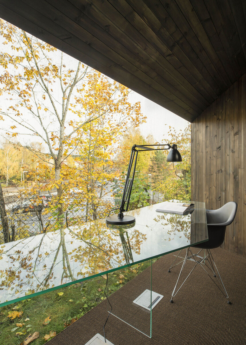 Архитектурное бюро JVA представило проект небольшого коттеджа писателя, расположенного на территории частного дома на окраине Осло, Норвегия. Постройка площадью 15 квадратных метров стоит в саду и используется хозяевами для работы и творчества. Они хотели, чтобы пространство было спокойным, дарило вдохновение и позволяло сконцентрироваться. При этом необходимо было обойти одно препятствие — расположение коттеджа возможно было лишь с видом на парковку и железнодорожную станцию, а заказчикам хотелось созерцать красивый пейзаж, напоминающий о родном доме на севере страны. Этот проект должен был стать заменой загородного дома. Поэтому архитекторы сохранили все деревья и кустарники на участке, а северный фасад выполнили полностью стеклянным, усиливая ощущения пребывания на природе и наполняя внутреннее пространство дневным светом. Стол также выполнили из стекла, чтобы подарить иллюзию лёгкости, возвышения над землёй. В южной части коттедж выполнен более высоким и узким, препятствую прони