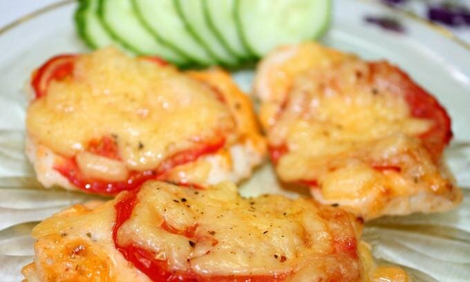 Курица под помидорами и сыром на 100грамм - 107.62 ккал Б/Ж/У - 18.82/2.5/1.32 Ингредиенты: