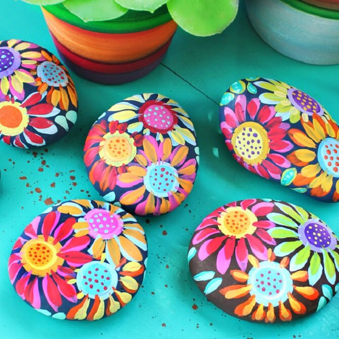 Роспись на камнях хороша тем, что доступна абсолютна каждому. Превратить камень в зверушку или цветущую клумбу сможет каждый, кто подберет камень нужной формы и приобретет акриловые краски.