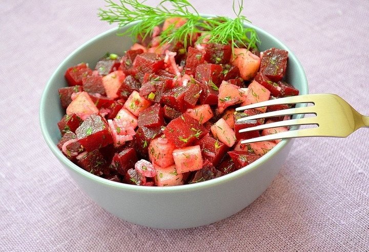 5. Заправить салат яблочным уксусом, капелькой масла, солью и душистым перцем. Хорошо перемешать.