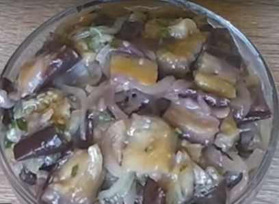 Баклажаны, приготовленные по нашему рецепту, имеют нежную текстуру и отличный вкус. Остановиться, просто невозможно! Ингредиенты 4 баклажана 3 луковицы 4-5 зубчиков чеснока 5 гр. сахара 20 гр. уксуса 30 гр. растительного масла 3 веточки укропа Соль и черный молотый перец по вкусу Приготовление Баклажаны нарезаем вдоль по 1 сантиметру толщиной и складываем на смазанный растительным маслом противень. Отправляем в духовку, предварительно разогретую до 200 градусов, на 20 минут. Вынимаем и нарезаем не большими кусочками. Лук очищаем и нарезаем полукольцами, мелко режем укроп. Добавляем черный молотый перец, соль, сахар, уксус и растительное масло. Перекладываем к баклажанам, перемешиваем и складываем в банку. Накрываем пластиковой крышкой и отправляем мариноваться в холодильник на сутки. Приятного аппетита!
