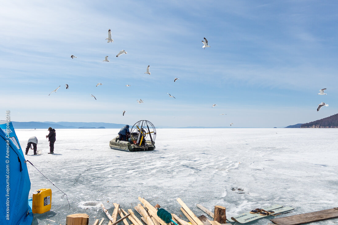 Когда вечером пара сотен человек приходят со льда и у берега начинают пороть и солить рыбу их слетаются тысячи.