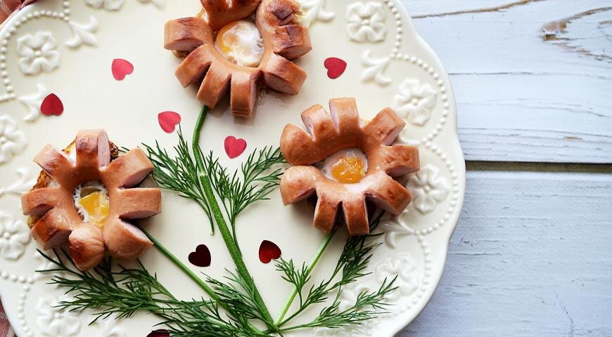 Очень простая, всем известная яичница, тоже может быть подана красиво. Такой завтрак точно не оставит Вашу любимую равнодушной. ИНГРЕДИЕНТЫ яйцо перепелиное 3 шт. сосиска 3 шт. укроп 3 шт. масло подсолнечное 1 ч.л. ПОШАГОВЫЙ РЕЦЕПТ ПРИГОТОВЛЕНИЯ Шаг 1 Сосиски почистить и нарезать гармошкой. Шаг 2 Аккуратно скрепить концы зубочисткой Шаг 3 Обжарить с одной стороны с добавлением масла. Шаг 4 Перевернуть и в середину каждого "Цветочка" разбить по перепелиному яйцу. Дожарить до готовности яйца. Шаг 5 Выложить на "стебельки" из веточек укропа.