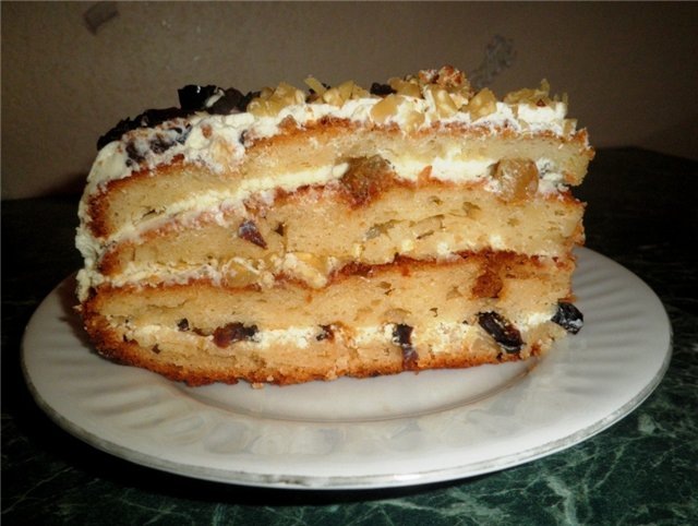 150 грамм жареного миндаля Приготовление: Смешиваем все вместе: муку, сахар, кефир, яйца, мед и добавляем разрыхлитель. Взбиваем миксером. Тесто делим на две части. Выпекаем в духовке два коржа. Готовые коржи остудить и разрезать вдоль на 2 части (вот такие они пористые получились) Пока пекутся коржи, прокручиваем через мясорубку чернослив, курагу и изюм (у меня только чернослив). Перемешиваем. Мелко рубим миндаль (у меня не было). Для крема смешиваем сметану с сахаром. Хорошо взбиваем даем постоять, чтобы сахар растаял и еще раз перемешиваем.