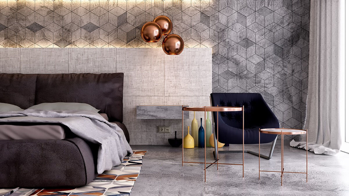 Спальня - очень личное, интимное пространство, но при этом именно в спальне нам даны безграничные возможности для декора. В любом случае, проводя экскурсию по дому для своих гостей, вы всегда можете пропустить спальню. В этой комнате всегда будет оставаться ваше личное предпочтение дизайна, без посторонних глаз, конечно, если вы сами этого хотите. Мы решили представить вам 7 потрясающих спален с яркими узорами и необычными материалами на стенах. Некоторые из этих дизайнерских акцентов вы можете воссоздать у себя дома. Дизайнер: Penint Design Studio Это спальня имеет непосредственное визуальное взаимодействие с грубой текстурой бетона в резком геометрическом рисунке, участвующем и в огромным изголовье кровати, и на полу. Медные лампы от Тома Диксона парят над столами и яркий узорчатый ковер возбуждает цветовую палитру. Дизайнер: Елена Седова Эта художественная монохромная спальня располагает тонкими белыми окрашенными панелями в качестве фона к потрясающему портрету на стене за кровать