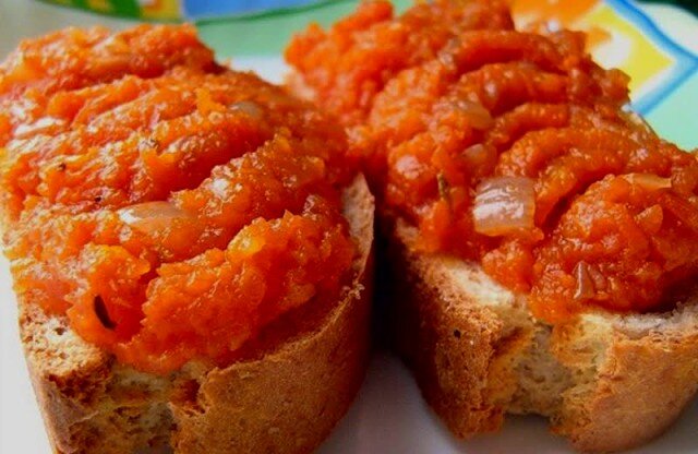 Морковь почистить. В очищенном виде её должно быть 1 кг. Пропустить морковь через мясорубку. Выложить на сковороду, добавить половину стакана растительного масла, перемешать и тушить до готовности. Чтобы не подгорело, можно подлить чуть-чуть воды. Репчатый лук почистить и пропустить через мясорубку. Выложить в глубокую сковороду (другую, или использовать после моркови, предварительно помыв). Добавить в сковороду полстакана растительного масла и томатную пасту, разведенную водой (1/4 стакана). Положить лавровый лист, перемешать и тушить до готовности. Лук и морковь тушить отдельно. Это важно! Тушеные морковь и лук соединить, посолить, добавить молотый перец и предварительно измельчённый чеснок. Перемешать, потушить ещё 6 минут. Охладить. Вымытые банки можно не стерилизовать. Остывшую морковную икру переложить в банки, закрыть крышками. Не закатывать.