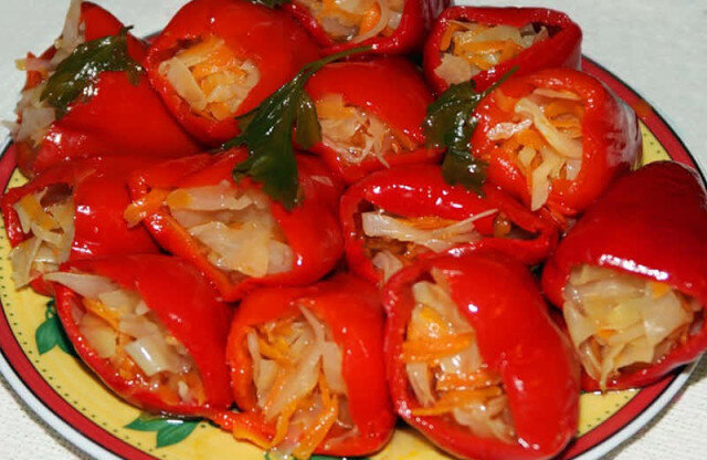Перец фаршированный капустой в маринаде. Особенный рецепт! Это просто ооочень вкусно! Ингредиенты: Перец сладкий – 3кг Капуста – 1 вилок весом 2,5кг Морковка -2 шт Чеснок 3-4 головки Маринад на 1 литр воды надо: Сахар -200гр Соль -1 ст. ложка Уксус 9% - 200мл. Масло растительное -100мл. Приготовление: 1.Перец тщательно вымыть, удалить плодоножку и семечки. Капусту нашинковать , добавить натёртую морковку, посолить по вкусу и перемешать.Чеснок выдавить через пресс. 2.В подготовленный перец кладём немного давленого чеснока и начиняем капустой. Начиненный перец укладываем вертикально в кастрюлю 3.Готовим маринад. В литр воды добавляем сахар, соль, масло, уксус всё кипятим и заливаем перцы. Одного литра будет мало для того что бы полностью залить перец. Сразу делайте маринад на 2 литра. 4.Кастрюлю с перцами в маринаде ставим на огонь. Варим 10-12 мин с момента закипания.В подготовленные банки укладываем перец, заливаем маринадом, закатываем крышками. Переворачив