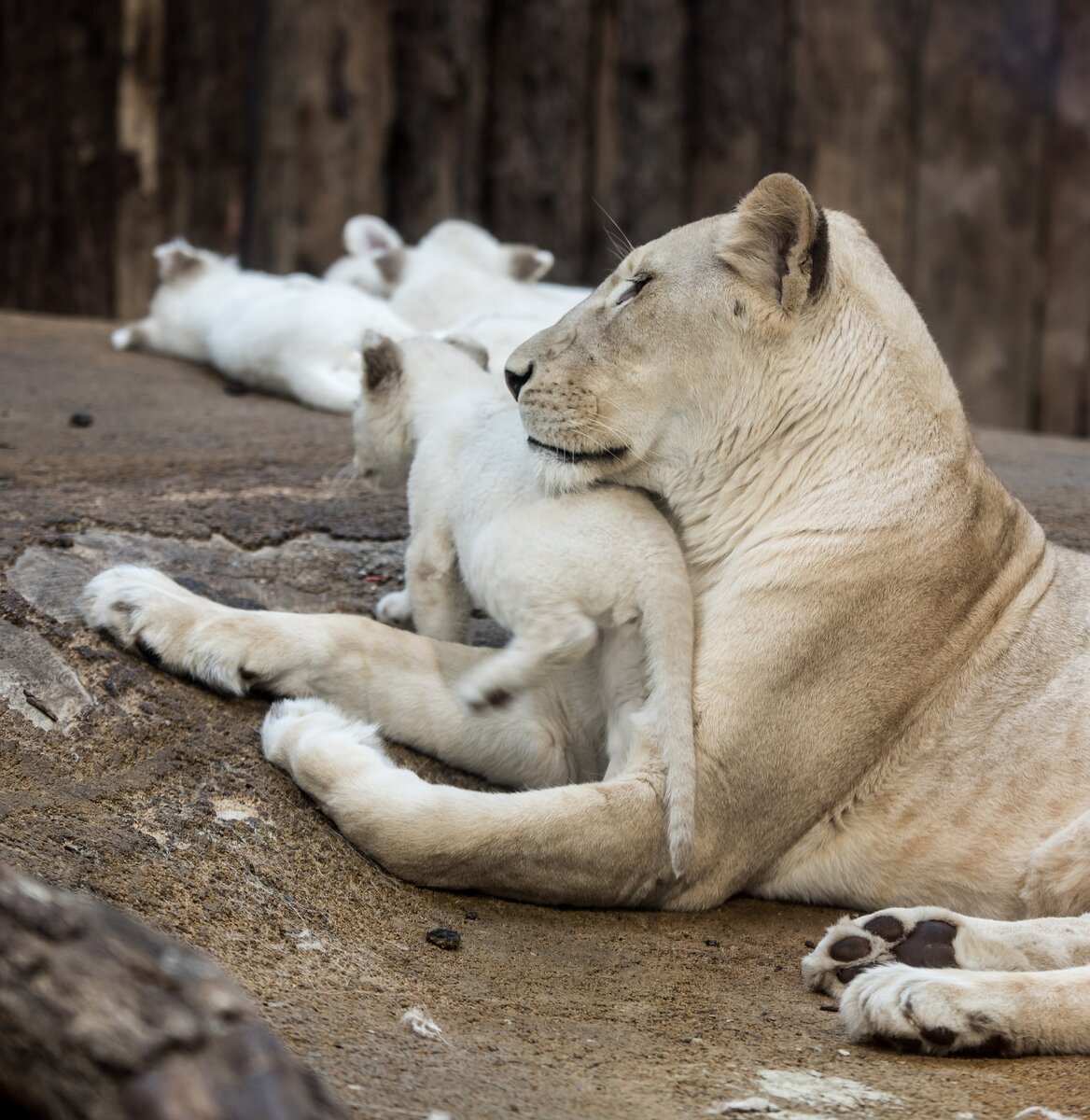 Белый лев не является отдельным подвидом. Это специфический полиморфизм с генетическим заболеванием — лейкизмом, вызывающим более светлую окраску шерсти, чем у обычных львов. Такое проявление по сути противоположно меланизму, с которым связано появление чёрных пантер. Однако белые львы не являются альбиносами — у них нормальная пигментация глаз и кожи. Белые трансваальские львы иногда встречаются в национальном парке Крюгер и смежном с ним резервате Тимбавати в восточной части ЮАР. Однако чаще этот подвид можно встретить в неволе, где заводчики специально разводят этих животных. Необычный кремовый цвет шерсти обусловлен рецессивным геном. По сообщениям некоторых авторов, белых львов разводили в Южной Африке для отстрела в качестве трофея. Подтверждения существования белых львов появились только в конце XX века. На протяжении сотен лет они считались плодом легенд, странствующих по Южной Африке. Наблюдения впервые были опубликованы в 1900-х годах, после этого случаи встреч с белым