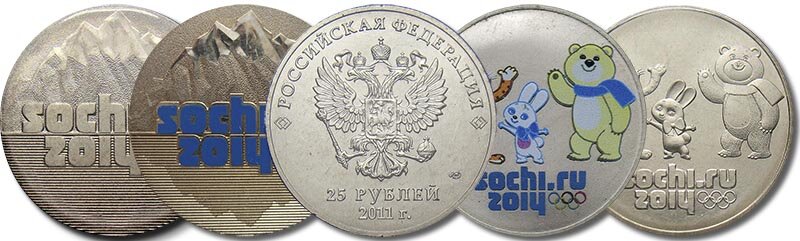 Таблица стоимости 25 рублевых монет Первые 25 рублевые монеты вышли в 2011 году, за три года до старта Сочинской олимпиады. И с тех пор, до самого начала игр, ежегодно выпускалось по одной монете. Памятные монеты выходили как в обычном исполнении, так и с цветными изображениями, нанесенным способом тампонной печати. Тиражи олимпийских 25-рублевок были по 10 млн. экземпляров. В том числе, по 250 тысяч монет в цвете, которые поступали в продажу упакованными в красочные сувенирные блистеры с защитной голограммой. Перед самым началом игр вышла четвертая монета олимпийской серии. Плюс повторили три вида, ранее вышедших монет, но с новой датой на лицевой стороне - 2014. Таким образом, олимпийская подборка составляет семь 25-рублевых монет для обращения и четырех цветных вариантов, предназначенных исключительно для коллекционеров. В конце 2016 г., начали выпускать памятные монеты, посвященные российскому Чемпионату мира по футболу 2018 года. Тогда вышла первая, из трех запланированных ме
