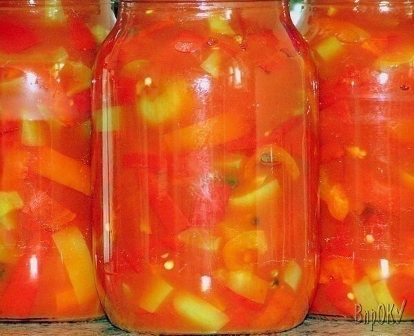 3 кг сладкого перца Способ приготовления: 1) помидоры проворачиваем через мясорубку, ставим кипятить, добавляя туда сахар, масло, черный перец, соль, лавровый лист, уксус.