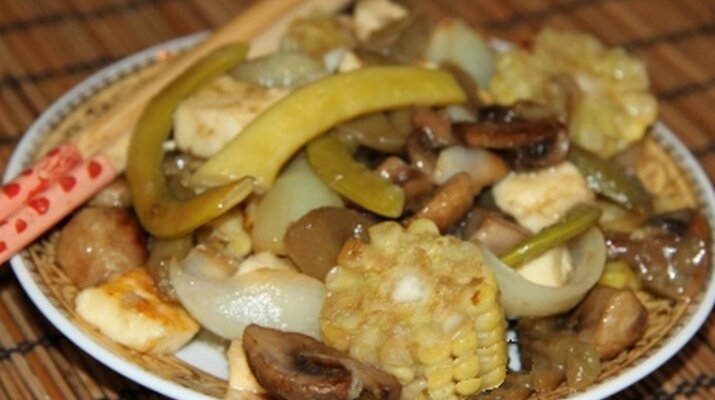 Оригинальная овощная закуска. Чего здесь только нет. Здесь и царица полей, и грибочки и баклажаны и много много другого. Из чего приготовить закуску 1. Шампиньоны — 200 г 2. Лук репчатый — 2 шт 3. Чеснок — 1 зуб. 4. Имбирь — 1 ч. л. 5. Сахар коричневый — 1 ст. л. 6. Мука — 2 ч. л. 7. Масло растительное — 2 ч. л. 8. Баклажан — 1 шт 9. Перец болгарский — 1 шт 10. Фасоль стручковая — 1 горст. 11. Соевый соус — 1 ст. л. 12. Сыр творожный — 200 г 13. Кукуруза молодая — 1 шт 14. Бульон овощной — 200 мл Как приготовить закуску Кукурузу нарежем колесиками, перец и баклажан соломкой, лук и шампиньоны на четыре части, чеснок и имбирь измельчаем. В сковороде вок в 1 ч.л растительного масла обжариваем , помешивая 7 минут все овощи. Отдельно обжариваем пару минут в 1 ч.л растительного масла сыр. Добавляем к сыру овощи, коричневый сахар,муку и соевый соус. Доливаем 200 мл. овощного бульона, прогреваем еще пару ми