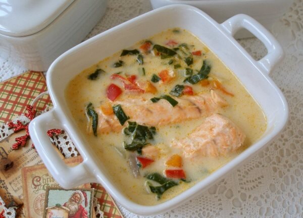Наивкуснейший сырный суп с лососем никого не оставит равнодушным! Продукты: 1. Лосось — 500 гр. 2. Лук — 1 шт. 3. Морковь — 1 шт. 4. Сладкий болгарский перец — 1 шт. 5. Шпинат — 1 пучок 6. Плавленый сливочный сыр — 200 гр. 7. Картофель — 2 шт. 8. Растительное масло — 1 ст. ложка 9. Соль — по вкусу 10. Перец — по вкусу 11. Сладкая молотая паприка — по вкусу 1. Рыбу очистить от чешуи, удалить жабры и плавники. 2. Положить рыбу в кастрюлю, залить двумя литрами воды и поставить на огонь. Когда вода закипит, снять пену и варить бульон 20 минут. 3. Лук, морковь и болгарский перец очистить и нарезать мелкими кубиками. 4. Картофель очистить и нарезать. 5. Шпинат вымыть и нарезать. 6. Сыр для супа нарезать кубиками. 7. Обжарить на растительном масле лук, морковь и перец. 8. Рыбу из бульона вытащить, отделить мясо от кожи, очистить от костей. 9. Бульон процедить, довести до кипения, добавить в него картофель и заправку из лука, моркови и перца, посолит