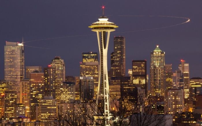 Космическая игла – Space Needle – обзорная башня, самая узнаваемая достопримечательность на северо-западе тихоокеанского побережья США и символ города Сиэтл. В 1959 году Эдвард Карлсон, будущий председатель правления Всемирной Ярмарки в Сиэтле 1962 года, посетил Штутгарт. Его настолько вдохновила местная телебашня космического вида, что он захотел построить что-то подобное к выставке в своем городе. Несмотря на отсутствие архитектурных и художественных навыков, бизнесмен сразу же набросал свое видение будущей башни на подставке для столовых приборов. Его рисунок лег в основу дизайна знаменитой “Космической иглы”. Космическая игла на фоне ночного города По идее Э. Карлсона, верх конструкции напоминал привязанный кабелями к шпилю аэростат, а вот нанятый для разработки проекте архитектор Джон Грэм настоял на превращении шара в летающую тарелку. В декабре 1961 года строительство «Космической иглы» было закончено. Она официально открылась в первый день выставки в 1962 году. Перед посетите