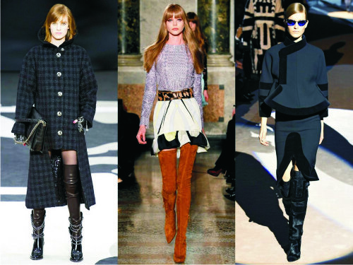 Наступила осень, а значит, пришла пора подумать о более теплой обуви, чем босоножки и туфли. В этом сезоне ботфорты стали одним из модных трендов и не сдают своих позиций. Отметим, что ограничений при выборе таких сапог практически нет. Но стоит обратить внимание на актуальные модели. Итак, в этом сезоне модные ботфорты заканчиваются не просто выше колена, а на середине бедра. При этом голенище сапог может плотно облегать ноги или же быть свободным. Модели с облегающим голенищем хорошо сочетаются с мини-юбками и трикотажными платьями, а ботфорты с широким голенищем можно носить с лосинами, скинни и узкими брюками. Остаются актуальными модели из кожи, а также из бархата. В цветовой гамме лидирует коричневый, синий, зеленый, бордо, черный и серый. Сапоги могут быть декорированы бахромой или шнуровкой. Также обратите внимание на ботфорты с оригинальным каблуком. Найти актуальные модели сапог можно в коллекция Giuseppe Zanotti, Santoni, Dior, Louis Vuitton, Saint Laur