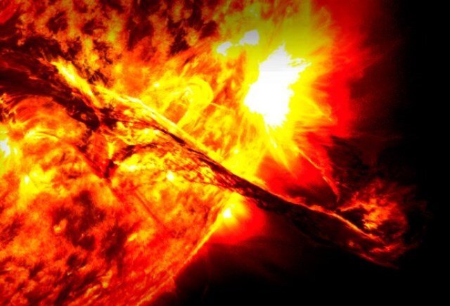 Солнечные вспышки происходят, когда магнитное поле Солнца, которое создает темные пятна на поверхности звезды, резко меняется, вызывая выбросы энергии. Такие солнечные вспышки могут вызвать радиационные бури в верхних слоях атмосферы Земли и вызывают отключения радиосвязи.