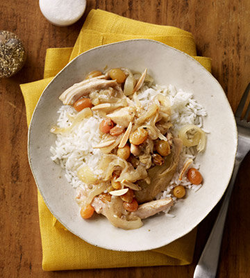 Корица - 2 шт. , Анис - 1/2 ч.л. , Мускатный орех - 1 ч.л. ) Процесс: Положите и перемешайте курицу, лук, чеснок, изюм, 1/4 чайной ложки соли, перец и бульон в скороварке. Накройте крышкой и томите 3 часа. В маленькой миске перемешайте оставшуюся 1/4 чайной ложки соли, "Гарам Масала", йогурт и кукурузный крахмал. Добавьте в йогурт, взбейте смесь йогурта, добавьте полученное за 15 минут
