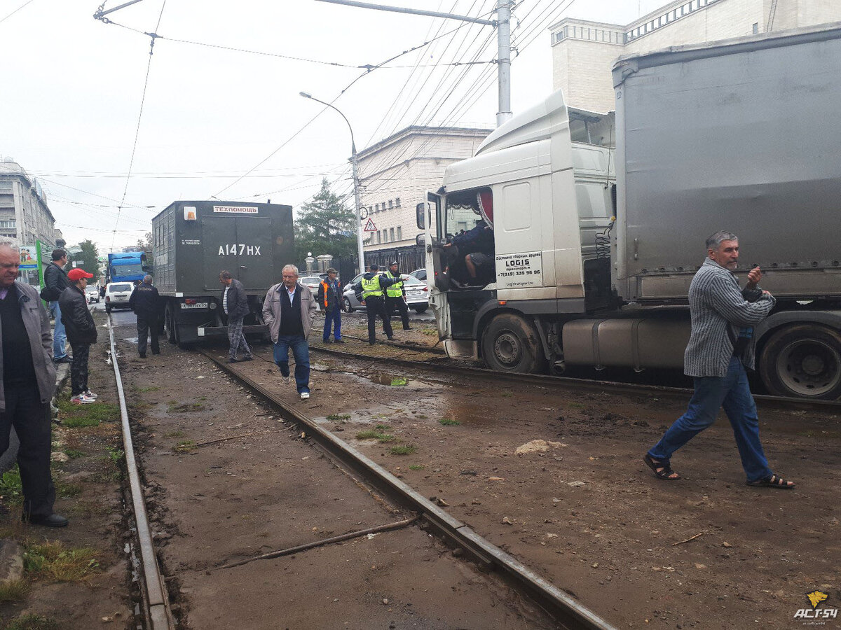 Фура встала на путях 13-го трамвая у Оперного театра в Новосибирске