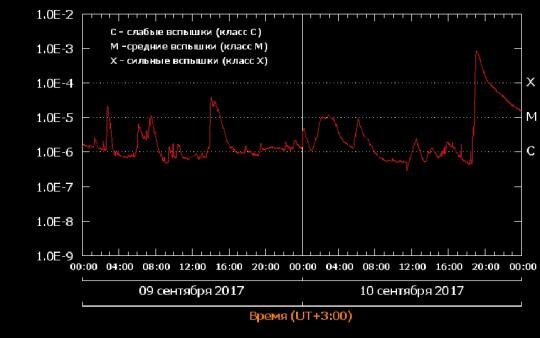 Ещё одну мощную солнечную вспышку за прошедшую неделю зафиксировали учёные вечером 10- го сентября. Ей присвоили наивысший класс активности – Х. «Вспышечная спираль раскрутилась в новую мощную вспышку на Солнце - произошло событие уровня X8.2. Это стало вторым за неделю событием, относящееся к крупнейшим в истории наблюдений Солнца», - отмечают астрономы. По словам учёных, этой вспышкой Солнце избавилось от «проблем». То есть в атмосферу звезды непрерывно выбрасывалась энергия вместе со всплывающими из глубин потоками. Не в силах сжечь такое количество энергии Солнце просто избавилось от неё одним выстрелом. Почти на протяжении недели, с 6 по 10 сентября, учёные из Лаборатории рентгеновской астрономии Солнца Физического института РАН им. Лебедева, фиксируют такие вспышки. Одна их них оказалась самой мощной за последние 12 лет (X9.3 балла). Вспышки классифицируются по нескольким типам, в зависимости от интенсивности рентгеновского излучения на пике: самые мощные - к классу X, мен