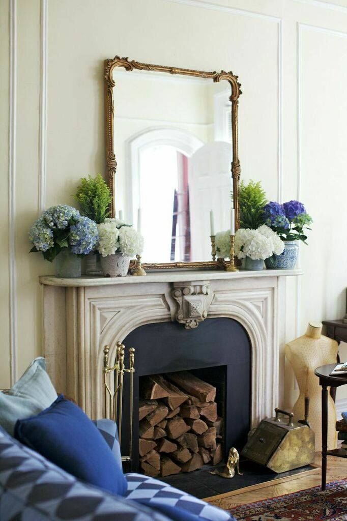 Разумеется, одно лишь зеркало, пусть даже в очень красивой раме — это еще не декор. Дополните его вазами или композициями с цветами, в зависимости от времени года можно добавить сезонный декор и свечи. Если вы любитель антиквариата, керамики — добавьте свои любимые экспонаты на каминную полку рядом с зеркалом.