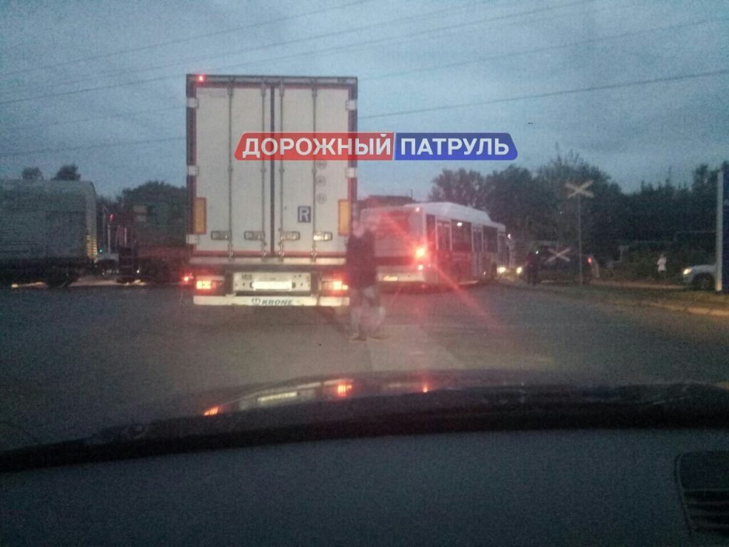 Со слов свидетелей этого происшествия, тепловоз столкнулся с пассажирским автобусом марки «Нефаз» и зацепил следовавшую за ним фуру. На этом участке автодороги образовалась пробка.