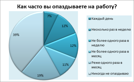 Самыми «пунктуальными» регионами оказались Тюменская и Белгородская области — там по 59% и 56% респондентов соответственно выбрали вариант «Никогда не опаздываю». По 11% жителей Москвы и Свердловской области, принимавших участие в опросе, признались, что опаздывают на работу каждый день.