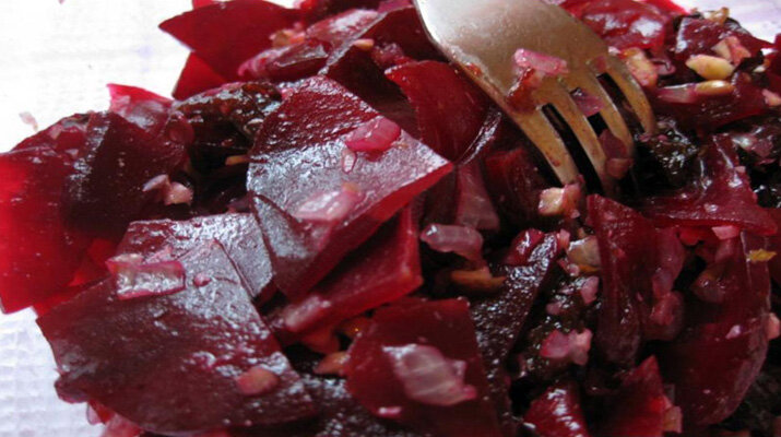 Такой салат из свеклы подавали королевской знати еще в 18 веке. И это не просто вымысел, старинная кулинарная книга, из которой взят рецепт, рассказывает даже как было принято подавать этот салат, в какой посуде и так далее. Но мы расскажем вам оригинальный рецепт, и самое удивительное то, что такой салат сегодня может позволить себе каждый человек. А о его пользе и говорить не стоит, ведь не стали бы кушать короли что попало?) А еще он очень вкусный, попробуйте! Ингредиенты: Свекла — 1 кг.; лук — 2 шт.; орехи — 200 гр.; чернослив — 300 гр.; подсолнечное масло — 100 мл.; молотый кориандр — 1 ст.л.; мед — 1,5-2 ст.л. Салат со свеклой. Пошаговый рецепт Залейте свеклу кипятком, отварите до полной готовности Затем очистите и нарежьте мелкими кусочками. Чернослив запарьте кипятком, и затем нарежьте мелко. Лук нашинкуйте и поджарьте на подсолнечном масле до золотистости. Ядра орехов растолките, и смешайте вместе с луком, нарезанным черносливом, медом и свеклой. При подаче