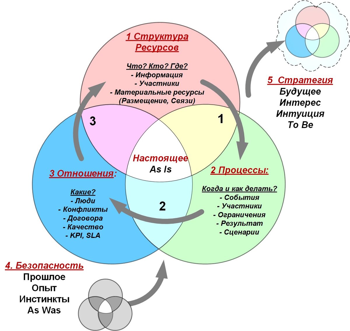 Любая возникающая ситуация сканируется нами практически мгновенно, в виде слегка расфокусированной, но целостной картинки. Однако рефлекторно реагировать на ситуацию так же быстро, в стиле "Бей, Беги или Замри", далеко не всегда эффективно. Требуется пауза, включение логики и анализ… Что делать в этой паузе, подсказывает сама природа. В своей речи, мы используем слова существительные (объекты), прилагательные (состояние объектов) и глаголы (деятельность). Эти простые лингвистические правила подсказывают, что любую ситуацию, любую систему лучше анализировать, фокусируясь в каждый момент времени только на одной из трех точек зрения: - Участники и Ресурсы (С кем и с чем имеем дело?) - Процессы (Как это все происходит? Кто и что делает?) - Отношение (Как я отношусь к происходящему? Зачем мне это?...) Именно на этих трех срезах фокусируются основные модели бизнес-анализа и проектирования. В случае же анализа больших и длительных процессов, к этим трем взглядам добавляются еще два: Анали