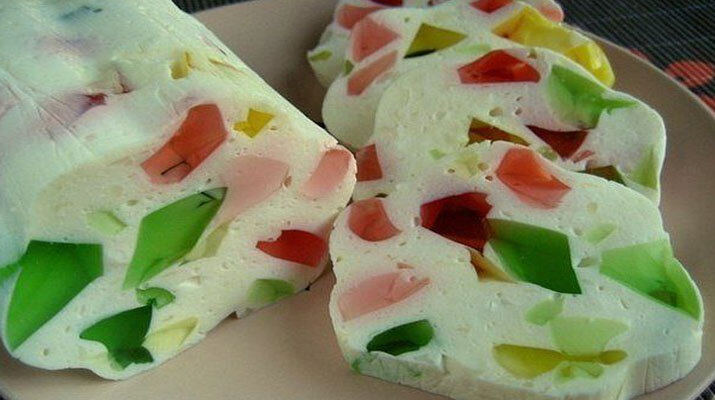 Подходит к любому чаепитию и даже к праздничному столу этот десерт из творога. Выглядит он — потрясающе, и никто не скажет, что на его приготовление вы потратили 10-15 минут! Ну какой малыш откажется от такого лакомства, а самое главное вы будете знать, что это полезно! Ингредиенты: творог — 0,5 кг.; ванилин; сахарная пудра — 0,5 стакана (можно использовать сахар); желатин 20 грамм + 4 ст.л. молока + 4 ст.л. воды. Любое быстро растворимое разноцветное желе, или разноцветные цукаты. А можно изюм. Десерт из творога. Пошаговый рецепт Творог взбейте блендером вместе с сахарной пудрой или сахаром, добавьте щепотку ванилина. Желатин растворите в теплой воде пусть набухнет 15-20 минут. Затем добавьте молоко и прогрейте желатин на огне, но не кипятите, можно также прогреть желатин и в микроволновке. Отдельно подготовьте заранее любое желе из пакетика, но лучше всего использовать цукаты. В творог добавьте подготовленный желатин с молоком, цукаты (или порезанное кубиками желе)