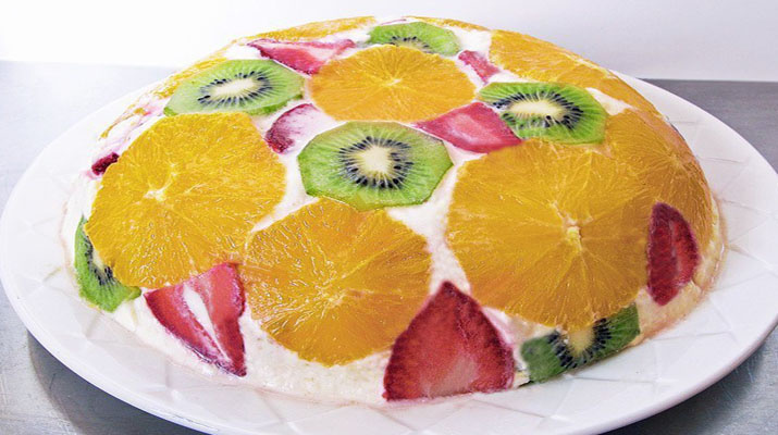 Торт без выпечки и творога зачастую готовят с песочной основой, но вот иногда хочется чего-то полегче, и именно этот десерт принято считать самое лучшей вариацией в этой теме. При подаче на стол такой красоты все гости придут в неподдельный восторг, а если вы приготовите своему маленькому нехочухе такой десерт из творога, то всегда будет кушать кушать восторг с удовольствием. Ингредиенты: 800 грамм творога; сметана — 250 гр.; молоко — 1 стак.; желатин — 30 гр.; сахар по вкусу; вообще можно брать любые фрукты и ягоды, но сегодня у нас апельсины, киви, клубника. Торт из творога без выпечки. Пошаговый рецепт Желатин замочите в молоке на 20 минут. Творог перебейте блендером со сметаной. по желанию можно добавить фрукты внутрь самого торта. Когда желатин набух, подогрейте его на огне, пока полностью не растворится. Добавьте растворенный желатин к творогу и хорошенько перемешайте. На дне небольшого салатника или силиконовой формы сделайте узор из нарезанных фруктов. Если д