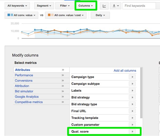 Чтобы овладеть искусством рекламы в Adwords нужно четко понимать что такое Показатель Качества (QS). Почему? Существует прямая положительная взаимосвязь между QS и ценой клика. Сегодня я покажу вам как можно отследить показатель качества при помощи специальных метрик. Отобразим показатель качества Если QS может влиять на вашу конкурентоспособность в AdWords, почему многие люди пренебрегают им? Технически он скрыт в вашем аккаунте. Выполните эти простые действия, чтобы отобразить показатель качества в вашем аккаунте: Вкладка ключевые слова Столбцы Изменить столбцы Атрибуты Показатель качества Но в AdWords есть и другие важные показатели качества: Показатель качества Аккаунта Показатель качества Группы объявлений Показатель качества Объявления Показатель качества Посадочной страницы Мобильный Показатель качества Однако AdWords позволяет увидеть только QS Ключевых слов. Google ранжирует Качество ключевых слов по шкале от 1 до 10. Где 1 самый худший и 10 – самый высокий. Вы должны стрем