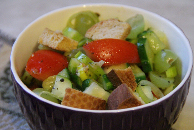 12. Перец халапеньо - 1 штука Инструкция приготовления 1. Разогрейте духовку до 180 градусов. 2. Порежьте деревенский хлеб на кубики, чтобы получилось 2,5 стакана, и выложите на противень одним слоем. Подрумяньте в духовке примерно 8-10 минут. Оставьте остывать на противне. 3. В ступке разотрите чеснок с солью и семенами кумина до состояния пасты. Взбивая, введите уксус и оливковое масло. 4. В большую миску выложите нарезанные кубиками помидоры, сухари, нарезанные кубиками огурцы, нарезанный перец, мелко нарезанный лук, нарезанный на половинки виноград и мяту. Залейте заправкой и хорошо перемешайте. Оставьте на 5-10 минут и подавайте.