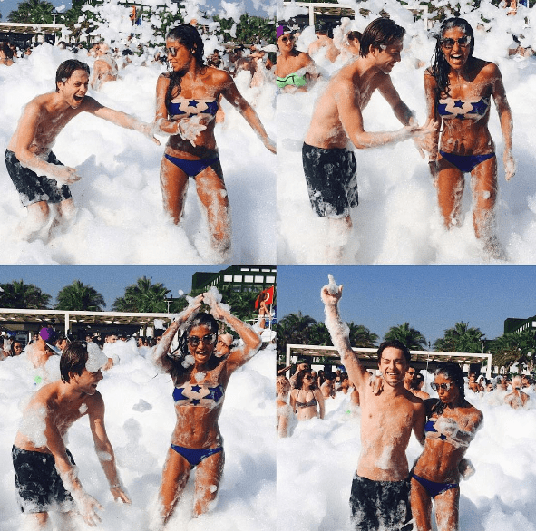 Отпуск Санты Димопулос на Лазурном берегу продолжается. На днях исполнительница стала участницей пенной вечеринки. В микроблоге звезды появился эффектный фотоколлаж с этого мероприятия. Отметим, что на фотографиях Санта запечатлена не одна, а в компании своего друга, который в этот день отмечал свой день рождения. Естественно, для пенной вечеринки Санта выбрала не женственное платье, а купальник, который подчеркивал ее прекрасную фигуру. Купальник-бикини состоял из синих плавок и бежевого топа-бандо с принтом в виде синих звезд разного размера. Образ певицы также дополнили солнцезащитные очки. Похоже, Санта Димопулос отлично проводит время на Лазурном берегу. На снимках звезда выглядит очень счастливой. Источник: http://glianec.com.ua/celebrities-style/33407-santa-dimopulos-v-bikini-zazhgla-na-pennoj-vecherinke-v-bikini-zazhgla-na-pennoj-vecherinke