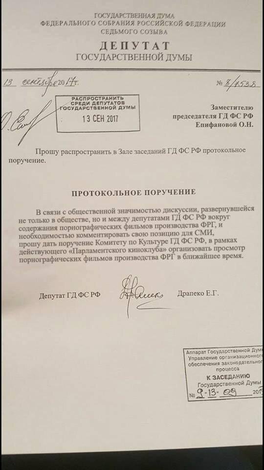 В сети появился текст протокольного поручения депутата Елены Драпеко в котором она просит организовать просмотр порнографических фильмов производства ФРГ по причине "широкой дискуссии, развернувшейся не только в обществе, но и между коллегами".