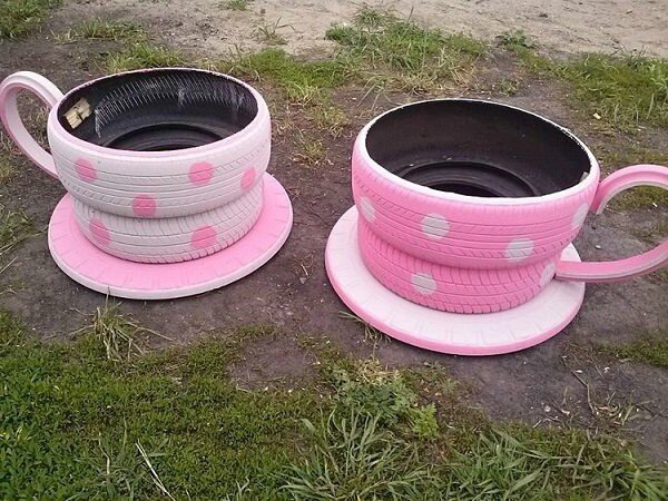 Приложив совсем немного труда и проявив минимум фантазии, из шин можно делать самые необычные цветочницы. Например, из пары покрышек можно сделать забавные клумбы-чашки. Блюдце, на котором расположена чашка, можно изготовить из любого прочного материала круглой формы: пластика, металла, фанеры или щита из досок, линолеума и даже бетона (если его залить в соответствующую форму). Правда, металл имеет обыкновение ржаветь, а фанера в контакте с водой довольно быстро сгниет, но какое-то время их будет защищать антисептическая пропитка и тщательное окрашивание. Чашку делают из двух-трех покрышек, причем желательно, чтобы нижняя была немного меньше, чем верхняя. У последней можно обрезать одну из боковин (этой обрезанной стороной ее укладывают кверху), но можно этого и не делать. Не помешает скрепить покрышки между собой хотя бы в паре точек. Ручку для чашки делают из разрезанной велосипедной шины, отрезка садового шланга или протекторной ленты. Ее можно привинтить саморезами к беговой дорож