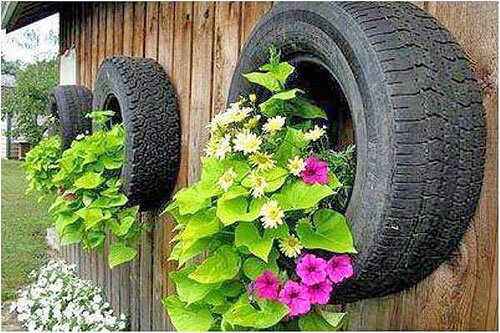 Из шин можно создать подвесные кашпо, которые украсят стену любого помещения (дома, летней кухни, душа) в виде висячих клумб. Для этого нужно всего лишь выбрать достаточно легкие небольшие покрышки и покрасить их в цвет, гармонирующий с общим оформлением участка. Развесьте их на стене. Для этого вполне достаточно вбить в последнюю пару крепких гвоздей. Заполните дно подвешенных вазонов (т. е. полость покрышек в нижней части) землей и высадите цветы. Для этих целей отлично подойдут вьющиеся сорта петуний или непривередливые бархатцы, которые будут выделяться на фоне здания. Если же вы не хотите вешать покрышки на стену, но у вас есть желание сделать более традиционное кашпо, покрышки вам все равно пригодятся. Разрежьте шину пополам, покрасьте в яркий цвет и пробейте на ее краях по паре отверстий с каждой стороны. В эти отверстия протяните прочный шнур и сделайте подвес. Такая подвесная цветочница ничуть не хуже любой покупной, а способ ее оформления зависит только от вас!