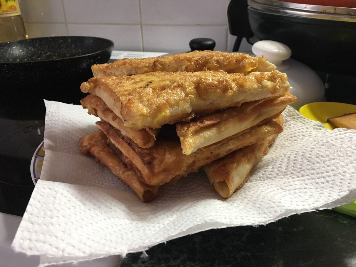 Взбиваем два яйца. Обмакивает каждый треугольник в яйцо и кладем в кипящее масло.
