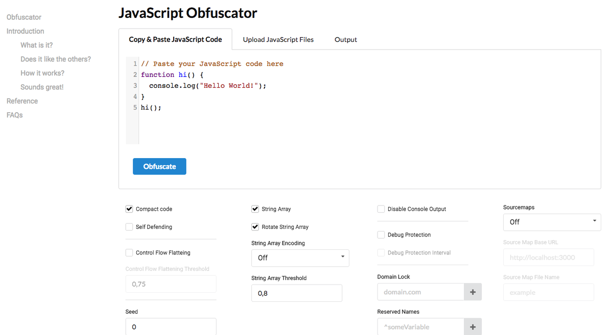 Javascript Obfuscator — бесплатный онлайн сервиc для обфускации и защиты кода на Javascript.