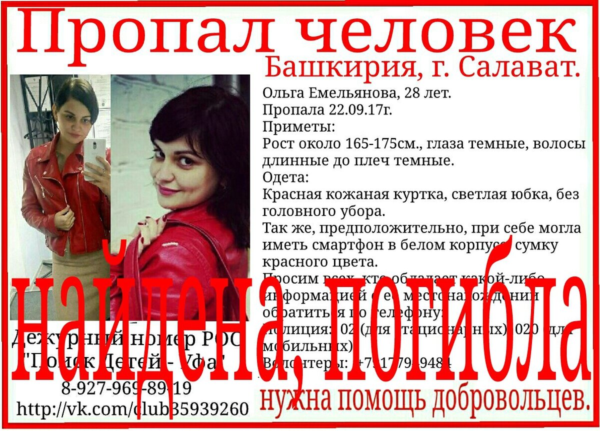 Волонтеры из поисковой группы сообщили в социальных сетях, что 28-летнюю Ольгу Емельянову нашли мертвой. Правоохранительные органы пока официально не прокомментировали данную информацию. Напомним, молодая мама двоих детей из города Салавата пропала днем 22 сентября. Она ушла с работы в неизвестном направлении. По информации некоторых местных СМИ, Ольга уехала на автомобиле с молодым человеком.
