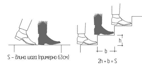 Классические размеры ступеней принято задавать 150(h)х300(b), где (h) - это подступенок (высота ступени), а (b) - это проступь (ширина ступени). Но не всегда получается разместить в здании лестницу с такими параметрами, потому что она занимает достаточно много места. Поэтому существует несколько формул для расчета параметров ступеней, чтобы сделать их приемлимыми и удобными в эксплуатации. Формула, основанная на длине шага. Длина шага человека (S) составляет от 60 до 66 см, в среднем 63 см. Исходя из этого выведена формула, определяющая удобство лестницы: 2h + b = S (63±3см) Формула удобства b - h = 12 см, Классические размеры ступеней принято задавать 150(h)х300(b), где (h) - это подступенок (высота ступени), а (b) - это проступь (ширина ступени). Но не всегда получается разместить в здании лестницу с такими параметрами, потому что она занимает достаточно много места. Поэтому существует несколько формул для расчета параметров ступеней, чтобы сделать их приемлемыми