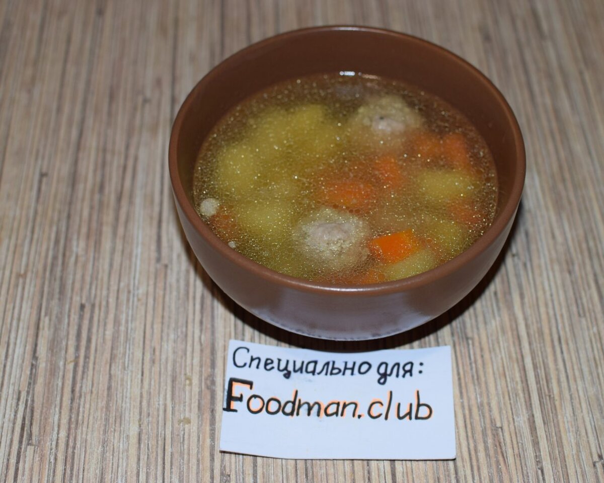 Картофельный суп с фрикадельками Очень простой рецепт вкусного и сытного первого блюда. Такой супчик должна уметь варить каждая хозяюшка. Ингредиенты: Картофель среднего размера — 6,7 шт. Морковь среднего размера — 1 шт. Луковица среднего размера — 1 шт. Фарш свиной/говяжий — 400 гр. Соль – 1 ст.л. Черный молотый перец – 1/4 ч. ложки Вода/бульон — 2 литра Приготовление: 1. Поставьте на огонь кастрюлю с водой и добавьте туда 0.5 ст.л. соли. 2. Вымойте и почистите картофель, морковь и лук. 3. Картофель и морковь нарежьте средними кубиками. 4. Фарш заправьте перцем и 0.5 ст.л соли и хорошенько перемешайте. 5. Сформируйте из фарша шарики, которые по размеру помещаются в ладошке. 6. Забросьте шарики из фарша в кипящую воду. 7. Также, в кипящую воду забросьте цельную головку лука (когда суп будет готов её можно целиком достать). 8. Добавьте в кастрюлю картофель и морковь. 9. Накрываем кастрюлю крышкой, и варим 40 минут на среднем огне. 10. Вкусный супчик готов, приятного аппетита! Автор