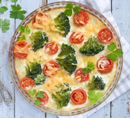 Приготовление: В форму для запекания всыпать овощи, выложить кусочки куриного филе. Приготовление заливки: Взбить яйца, добавить йогурт и специи. Залить овощи. В духовку на 180 градусов на 30 минут.