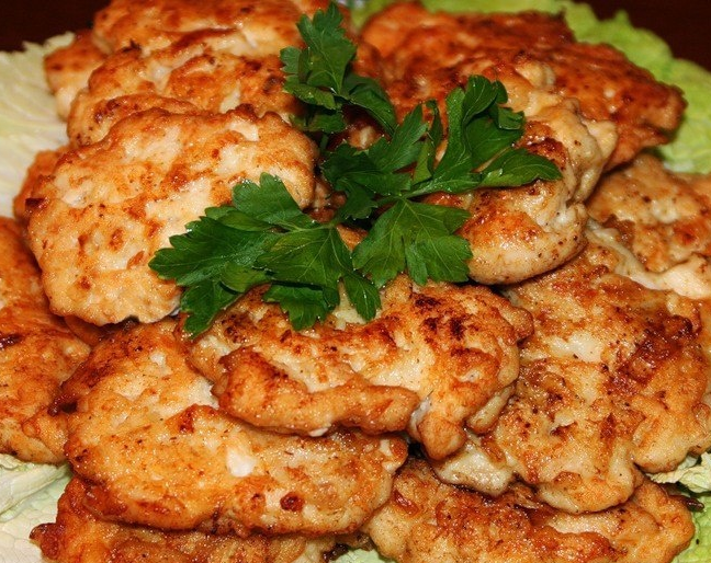 Приготовленные по нашему рецепту котлеты, получаются более сочными, нежели обычные котлеты. Обязательно приготовьте их по нашему рецепту, это блюдо станет частым гостем на вашем столе. Ингредиенты 700 гр. филе курицы 2 яйца 1 луковица 50 гр. майонеза 30гр. кукурузного крахмала Соль и черный молотый перец по вкусу Щепотка куркумы и приправы для курицы Растительное масло Приготовление Филе тщательно помоем, обсушим и нарежем очень мелкими кусочками. Добавим яйца, майонез, соль, специи и натертый на терке лук. Перемешаем, постепенно, мелкими порциями добавим кукурузный крахмал, снова тщательно размешаем и поставим в холодильник на 40-50 минут. За это время филе промаринуется, и немного разбухнет от крахмала. Жарим с двух сторон на растительном масле, выкладывая ложкой на сковороду, на среднем огне до золотистого цвета. Выкладываем на бумажное полотенце, для удаления лишнего жира. Приятного аппетита!