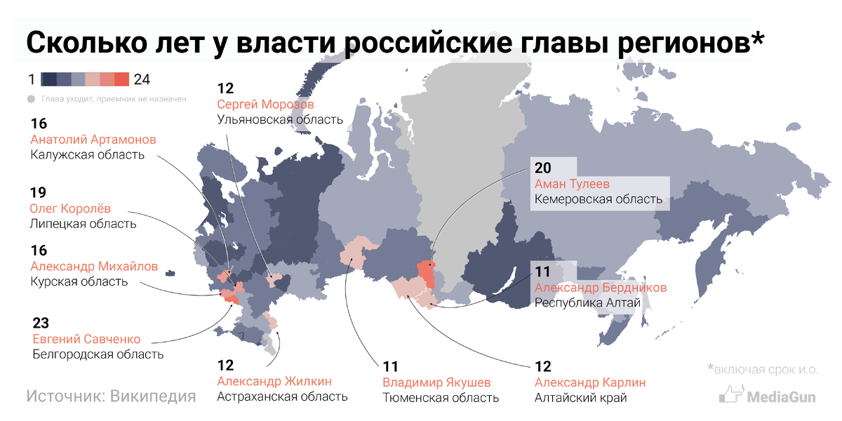 В сентябре 2017 года началась новая волна отставок губернаторов. Мы решили посмотреть, кто из глав регионов дольше всех у власти. Данные актуальны на утро 29 сентября. Всего с начала 2017 года назначено 11 новых глав регионов. Рамазан Абдулатипов (Республика Дагестан) и Виктор Толоконский (Красноярский край) объявили о своей уходе, приемники пока не назначены. Больше работ в блоге.