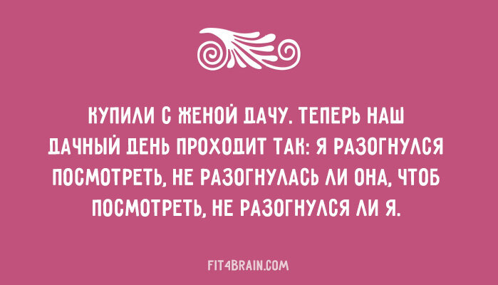 Маленькими семейными радостями и трудностями наполнен каждый наш день. И только от нас зависит, как к ним относиться. Но не забывайте: уделяйте больше внимания радостям – и они увеличатся многократно, решайте трудности сразу или, если это невозможно, забывайте о них – и их будет становиться всё меньше и меньше. И ничто так не помогает придерживаться этих советов, как чувство юмора: Источник: http://fit4brain.com/8783
