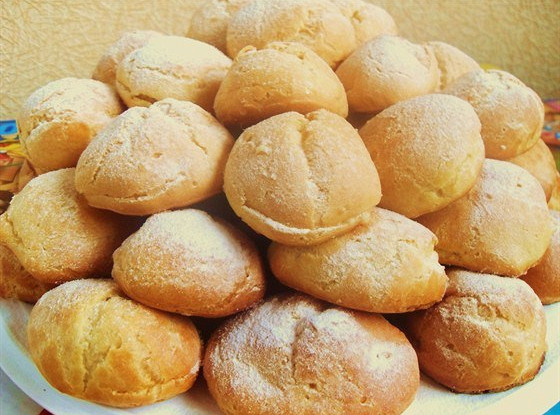 8. Пшеничная мука - 1 стакан Инструкция приготовления 1. Маргарин, соль и воду довести до кипения, перемешать, снять с огня. Всыпать муку, перемешать, вернуть на медленный огонь и проварить 2–3 минуты. Снова снять с огня и дать полностью остыть. 2. В остывшую массу вбить по одному все яйца (тесто должно тянуться и быть однородным). Выложить на противень ложкой (в зависимости от размера ложки, варьируется размер булочек), оставить промежутки, чтобы им было, куда подниматься. Поставить в разогретую духовку и выпекать на среднем огне 30–35 минут до золотистой корочки. 3. Взбить сгущенное молоко, размягченное сливочное масло и сок 1 лимона. 4. Булочки остудить и сделать надрез ножом вдоль основания, начинить кремом (крема не нужно много, иначе будет очень жирно и сладко).